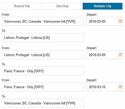 2. Search for a flight from Vancouver (YVR) to Barcelona, Spain (BCN) or Lisbon, Portugal (LIS)