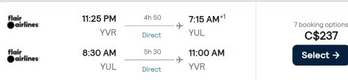 Flair is showing flights from Vancouver to Montreal for $357 CAD roundtrip including taxes.