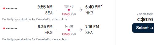 Air Canada has dropped the price of their flights from Seattle to Hong Kong down to $625 CAD roundtrip including taxes.
