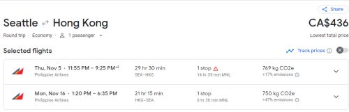 Google Flights: Seattle to Hong Kong