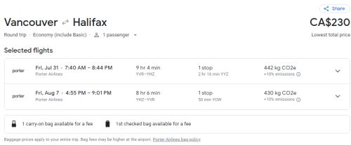 Google Flights: Vancouver to Halifax, Nova Scotia