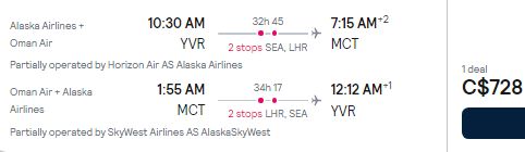 Alaska Airlines and Oman Air have dropped the price of their flights from Vancouver to Muscat, Oman down to $832 CAD roundtrip including taxes.
