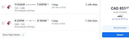 China Eastern has dropped the price of their flights from Vancouver to Colombo, Sri Lanka down to $822 CAD roundtrip including taxes.