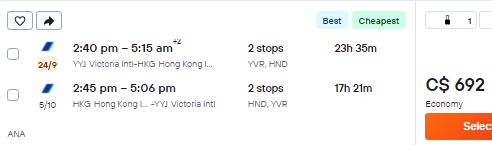 The flights have 2 stops each way, in Vancouver and Tokyo, Japan.